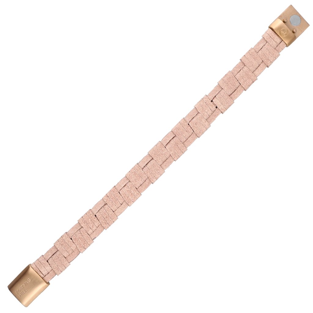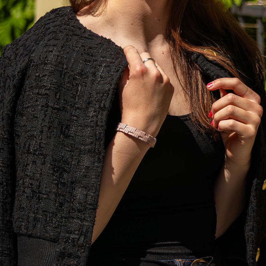 Růžově zlatá s PVD úpravou a kartáčovaným povrchem.