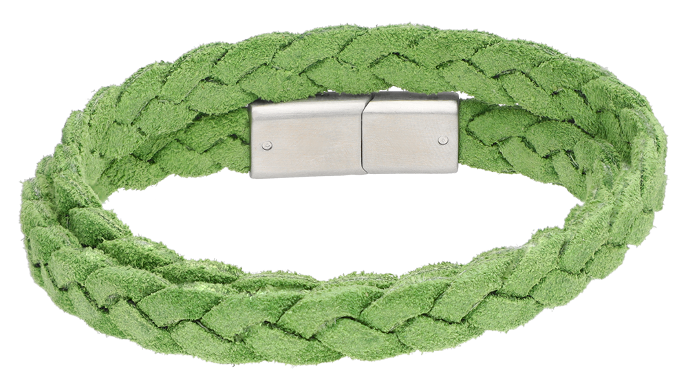 Pistáciová jemná kůže dvakrát omotaná kolem zápěstí dodává svěží akcent.